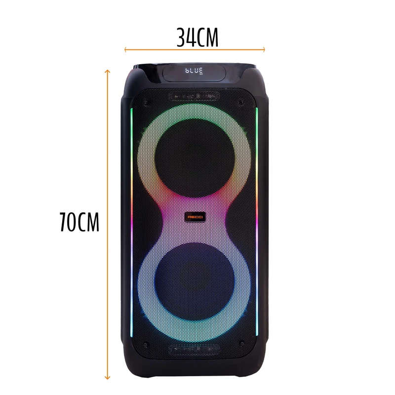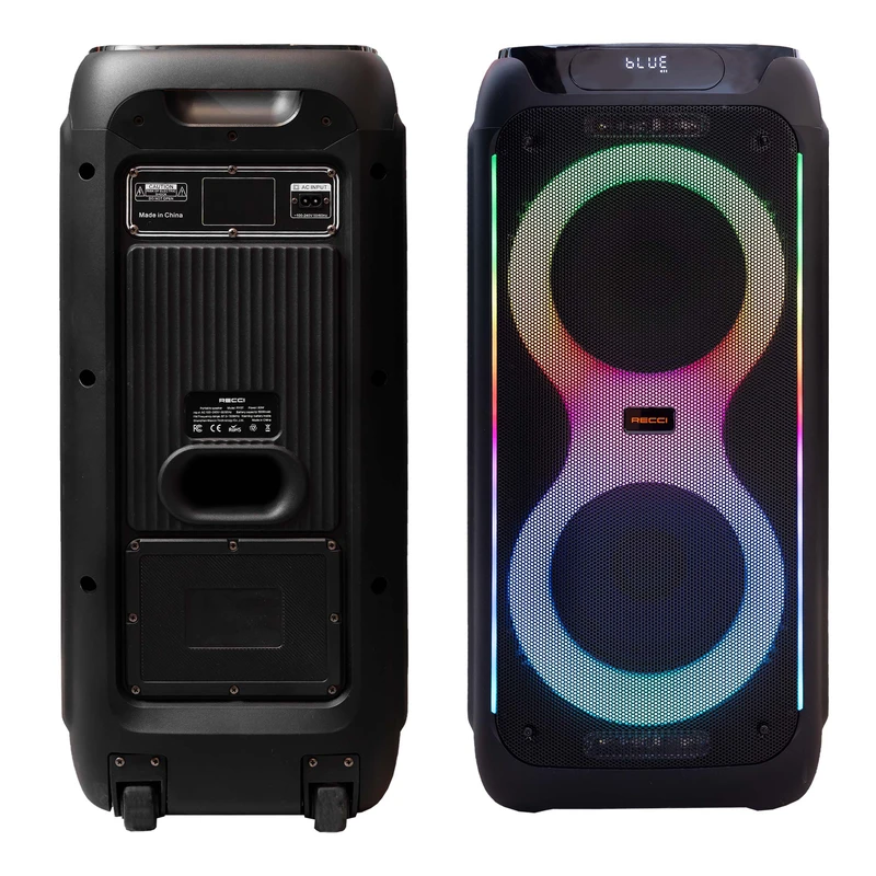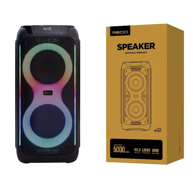 اسپیکر بلوتوثی چمدانی RECCi مدل RY07 گزینهای عالی برای افرادی است که به صدایی با توان بالا و کاربرد چندمنظوره نیاز دارند. این اسپیکر ۸۰ واتی، همراه با باتری ۵۰۰۰ میلیآمپرساعتی، مناسب برای پخش موسیقی در فضای باز و فضای بسته است