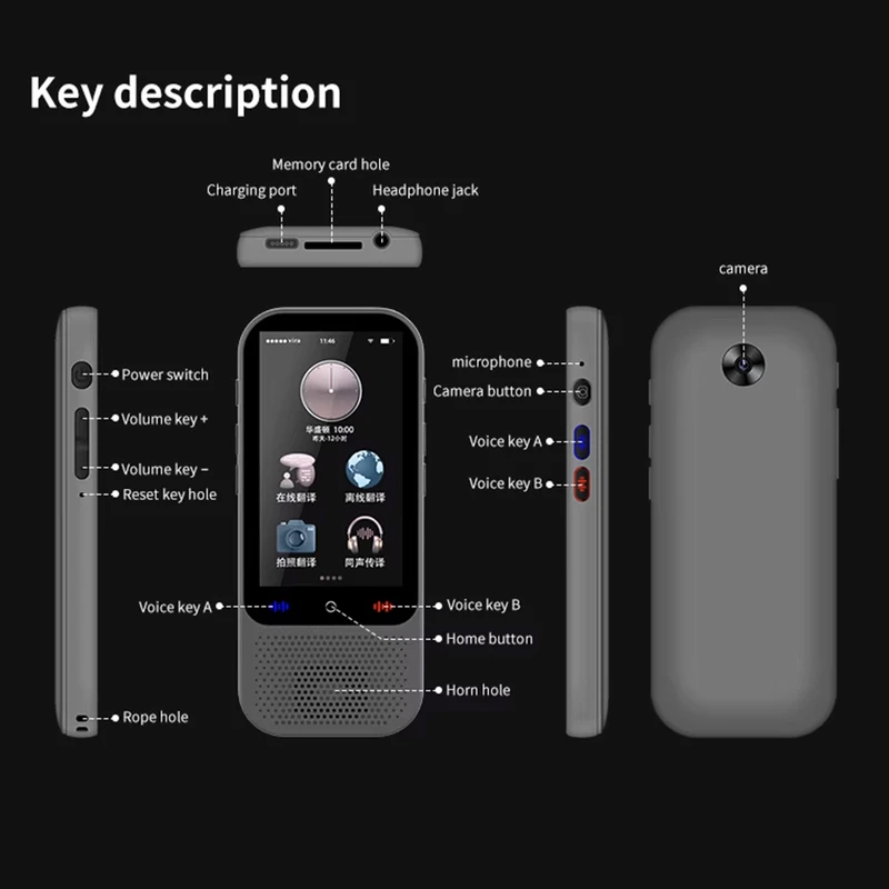 | قابلیت های ویژه | ابعاد نمایشگر: 2.0 اینچ (240*320 پیکسل), ایجاد گروههای ترجمه چند زبانه با قابلیت پشتیبانی از 117 نفر در یک گروه, پردازنده چهار هستهای با GPU داخلی, پشتیبانی از ترجمه متنی و صوتی, پشتیبانی از چندین لهجه از زبانهای مختلف (انگلیسی، عربی، اسپانیایی، هندی), پشتیبانی از فایلهای چندرسانهای (موسیقی و ویدیو), ترجمه صوتی همزمان آنلاین 138 زبان و 18 زبان به صورت آفلاین در 0.1 ثانیه, حافظهی داخلی 8 گیگابایت + رم 1 گیگابایت با قابلیت پشتیبانی از کارت TF حداکثر 32 گیگابایت, دستیار صوتی هوشمند برای یادگیری زبان، تبدیل واحدها و نرخ ارز, سازگاری با ChatGPT |