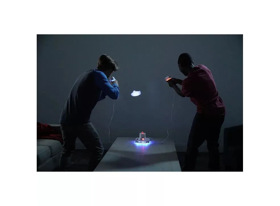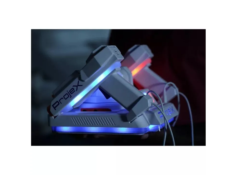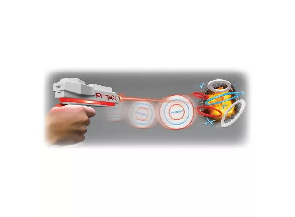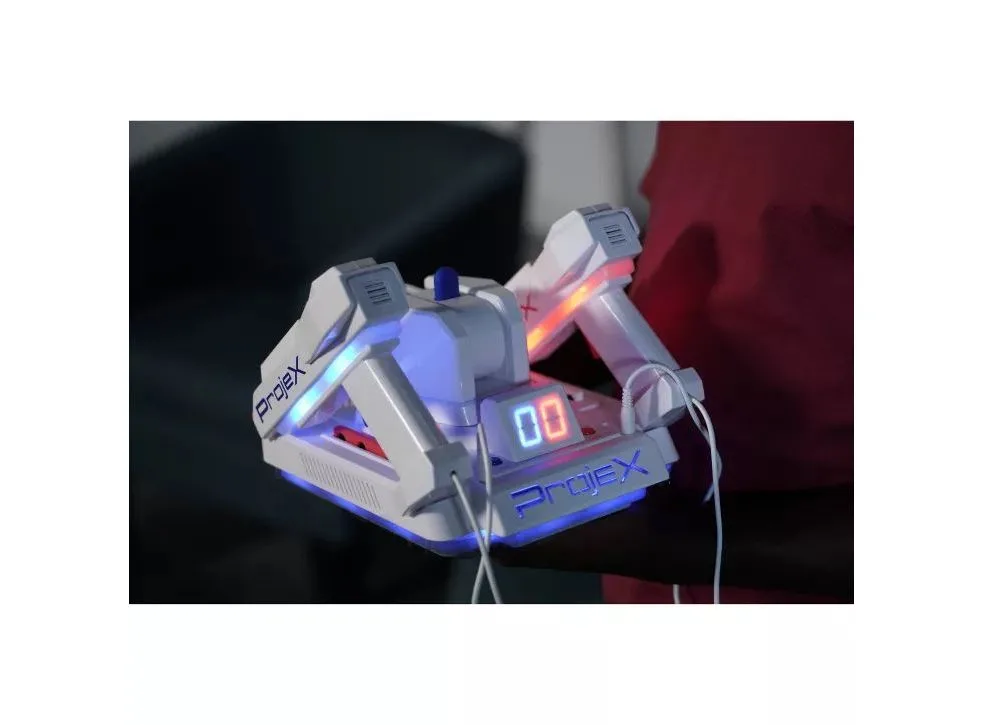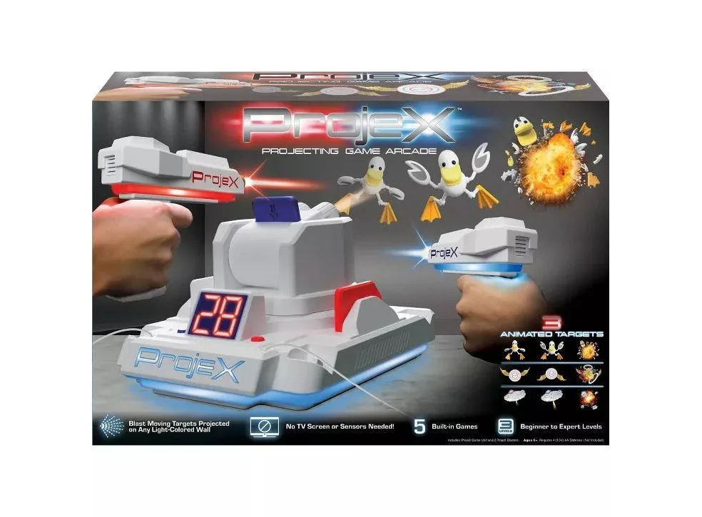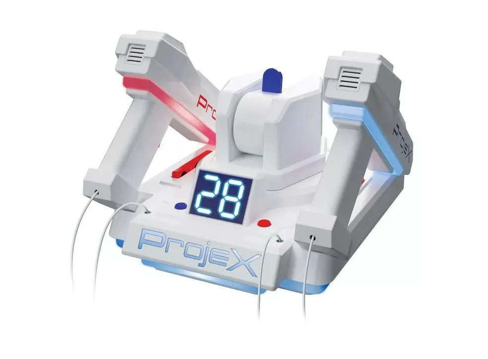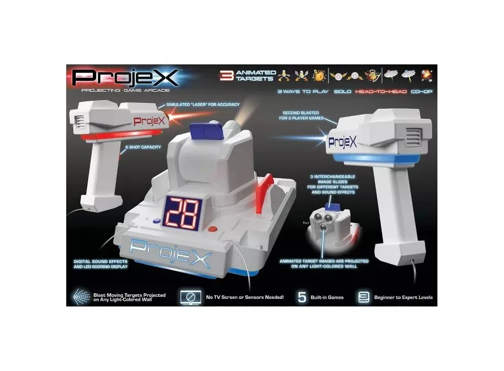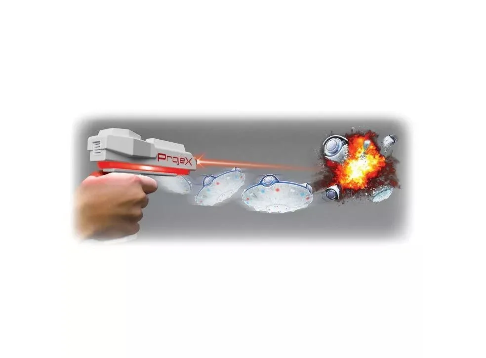 تفنگهای لیزری ProjeX هر اتاقی را به یک بازی باورنکردنی تبدیل میکنند . داخل خونه یا بیرون از آن هرجا که دیوار خالی دیدید، ست بازی پرژکتور و تفنگهای لیزری رو در بیارید و تنها یا در یک گروه دونفره و یا حتی در مقابل هم، تصاویر متحرکی رو که مستقیماً بر روی دیوار شما پخش میشود شامل اردکها، بشقابپرندهها و یا هدفهای دیگر را با این تفنگهای لیزری منفجر کنید، از مرحله مبتدی به پیشرفته و سپس به تخصصی پیش برید و به قهرمان قهرمانها تبدیل بشید! این ست بازی با داشتن 5 بازی با صداهای مختلف قراره حسابی شما رو به چالش بکشه و سرگرم کنه. پس وقت رو تلف نکنید یکی از تفنگهای آبی یا قرمز رو انتخاب کرده، آن را در دست گرفته و شلیک کنید .