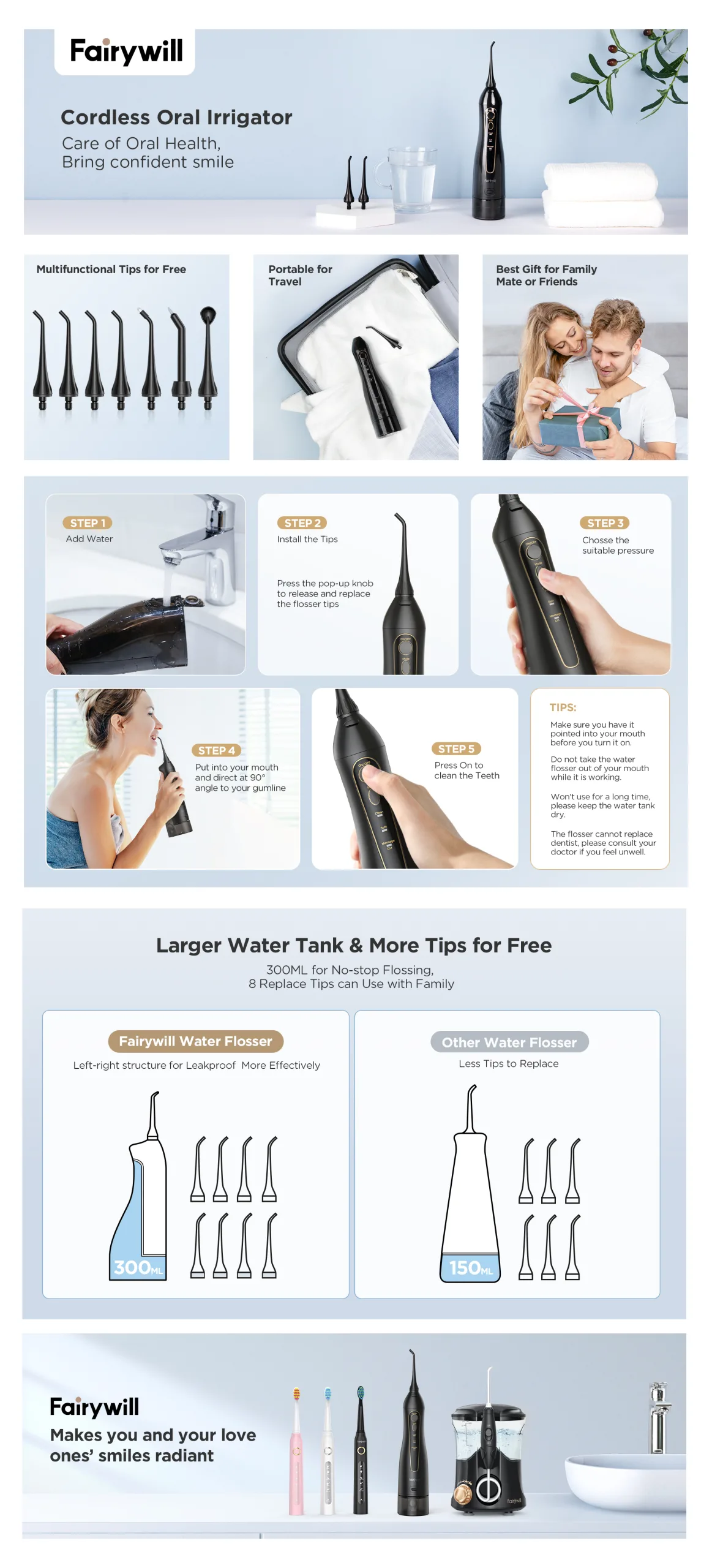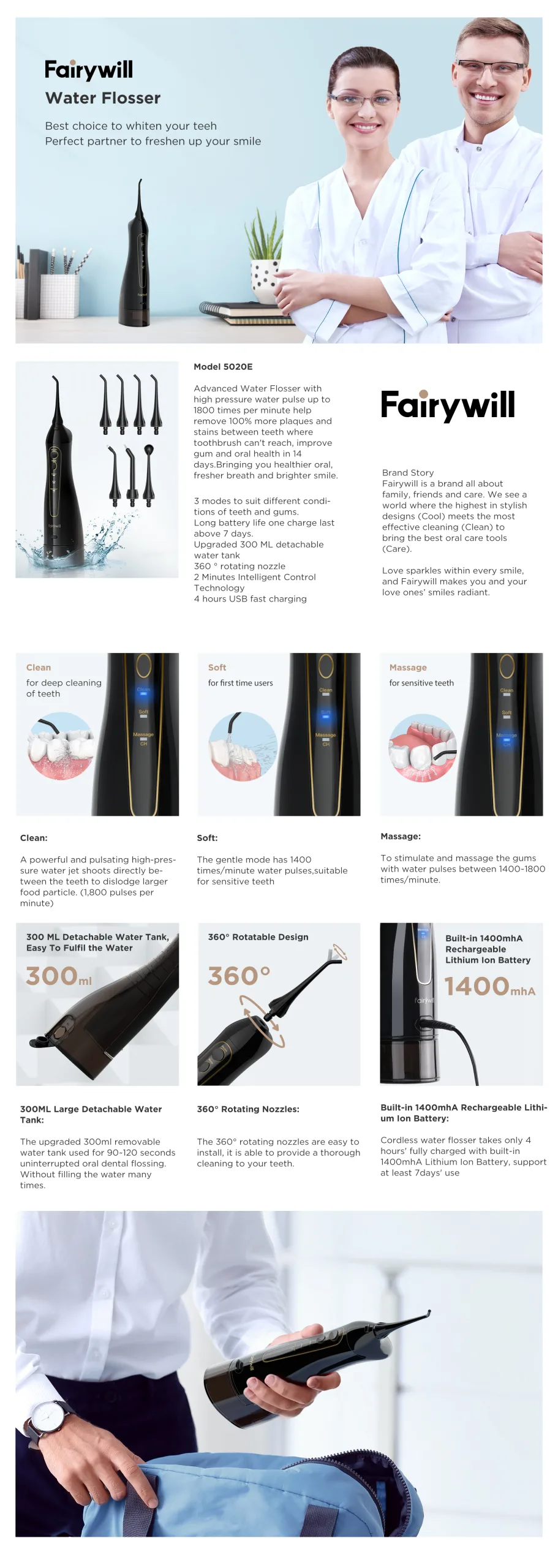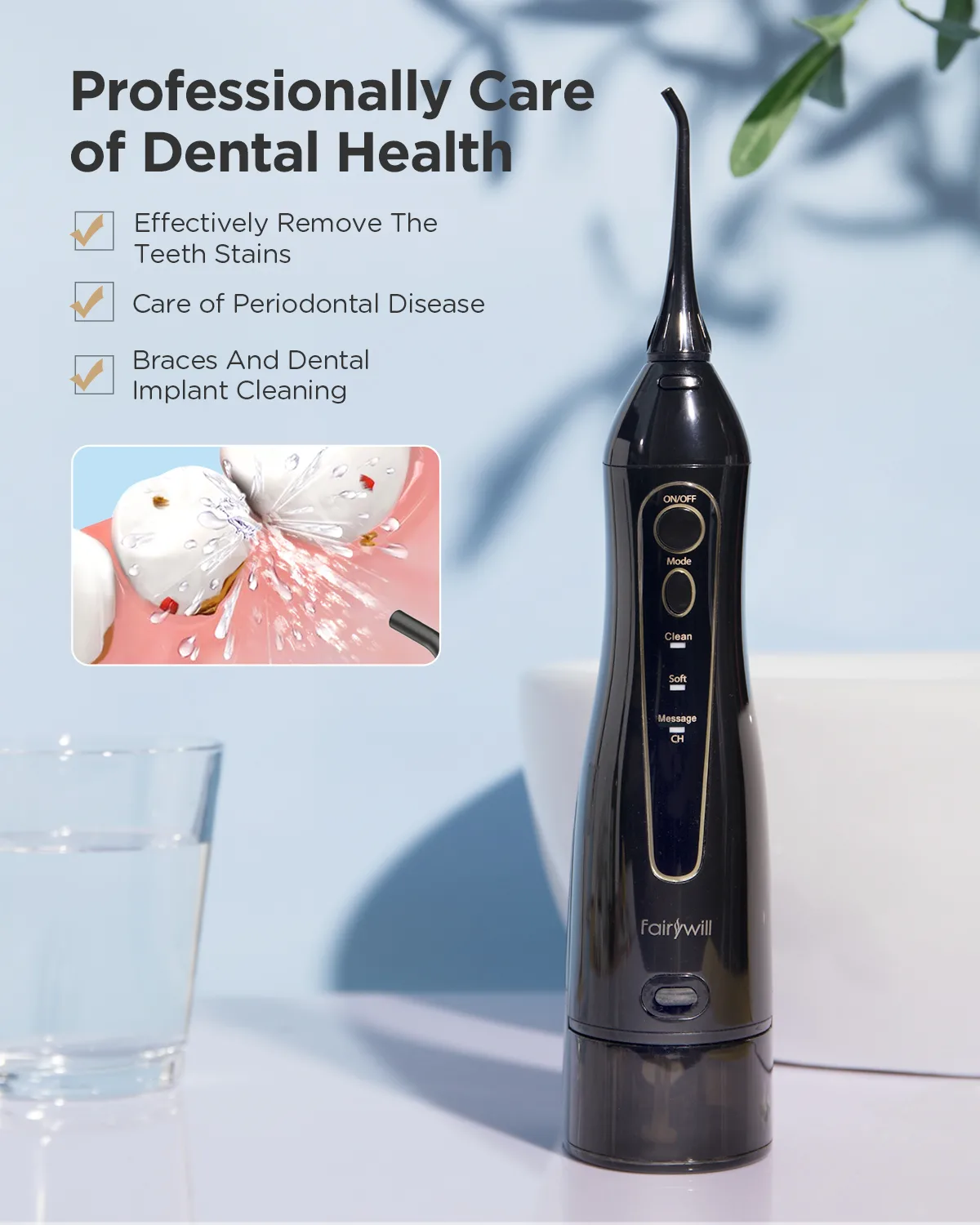 اگر بهدنبال جایگزینی حرفهای و مؤثر برای نخ دندان هستید، واترجت FAIRYWILL مدل F5020E انتخابی هوشمندانه است. این دستگاه بیسیم با طراحی ارگونومیک و عملکرد قدرتمند، مراقبت از سلامت دهان را به سطح جدیدی ارتقا میدهد.