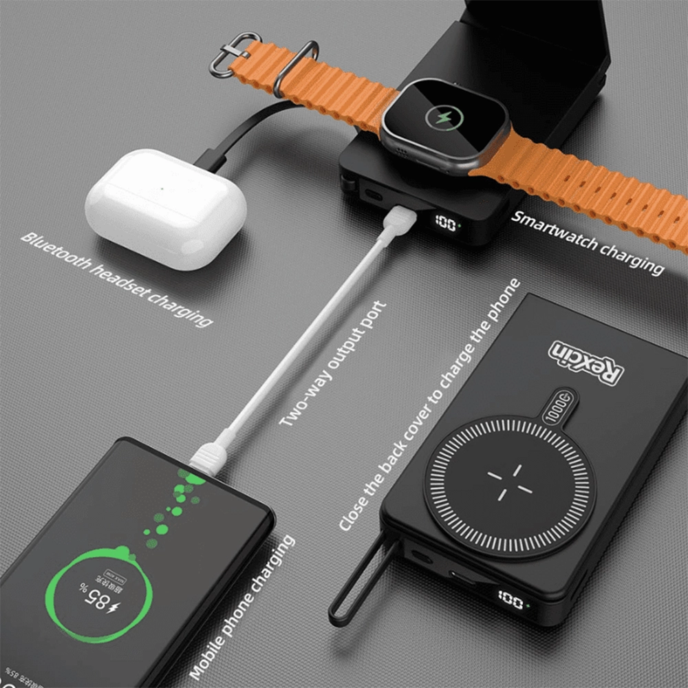 پاوربانک STAND REX-WP11 مجهز به ظرفیت بالای 10000 میلیآمپر است که برای چند بار شارژ گوشی یا سایر دستگاههای دیجیتال کافی است. علاوه بر قابلیت شارژ بیسیم، این مدل دارای پورتهای USB و Type-C نیز هست که امکان شارژ چند دستگاه را بهطور همزمان فراهم میسازد.