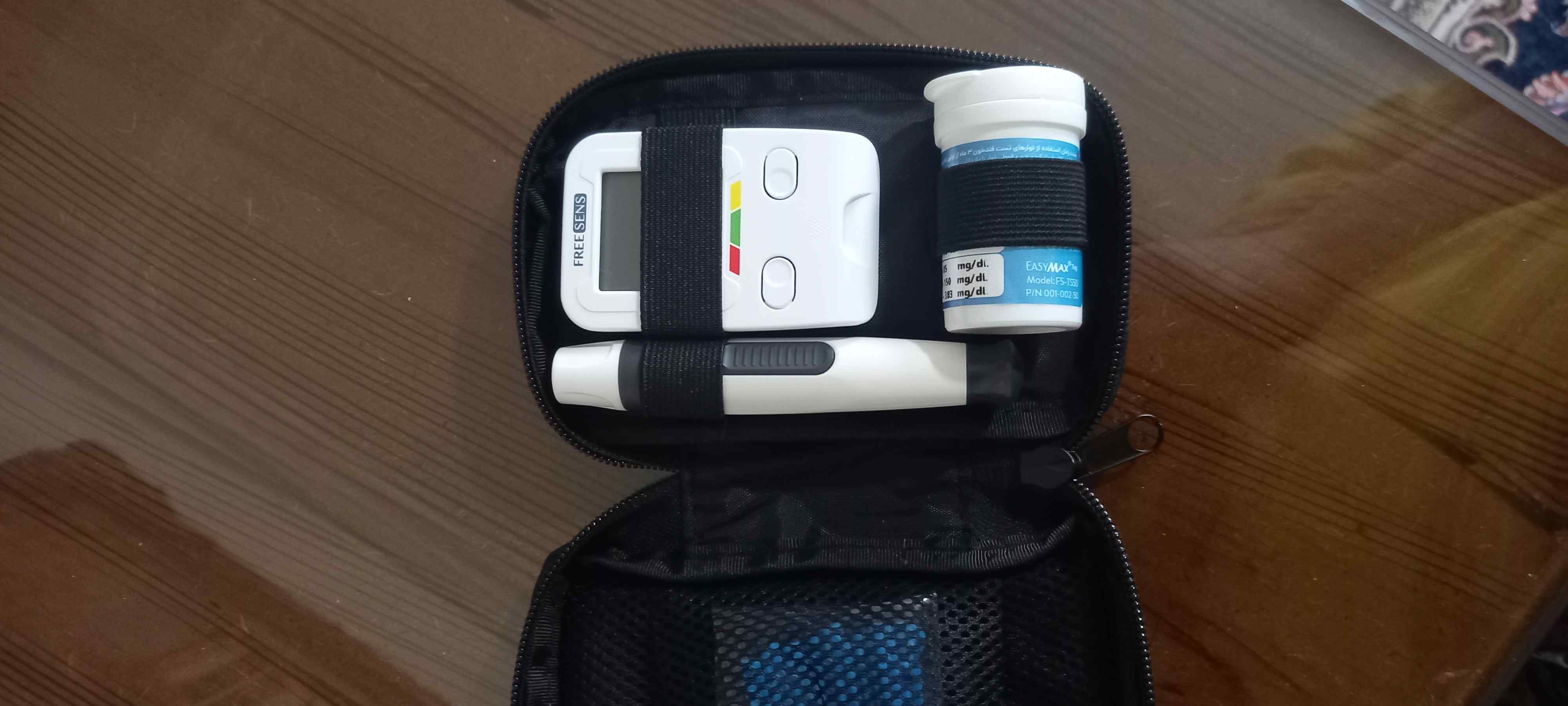 اقلام همراه: دستگاه قند خون، ۵۰ عدد نوار تست، دفترچه راهنما، کیف نگهدارنده